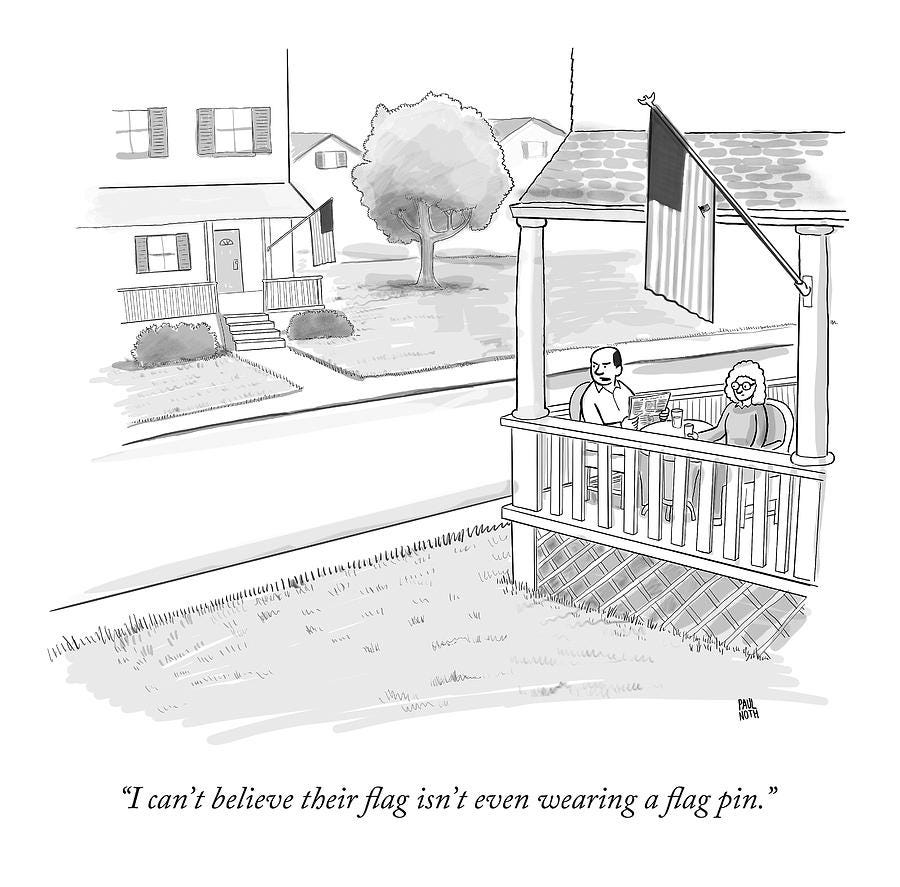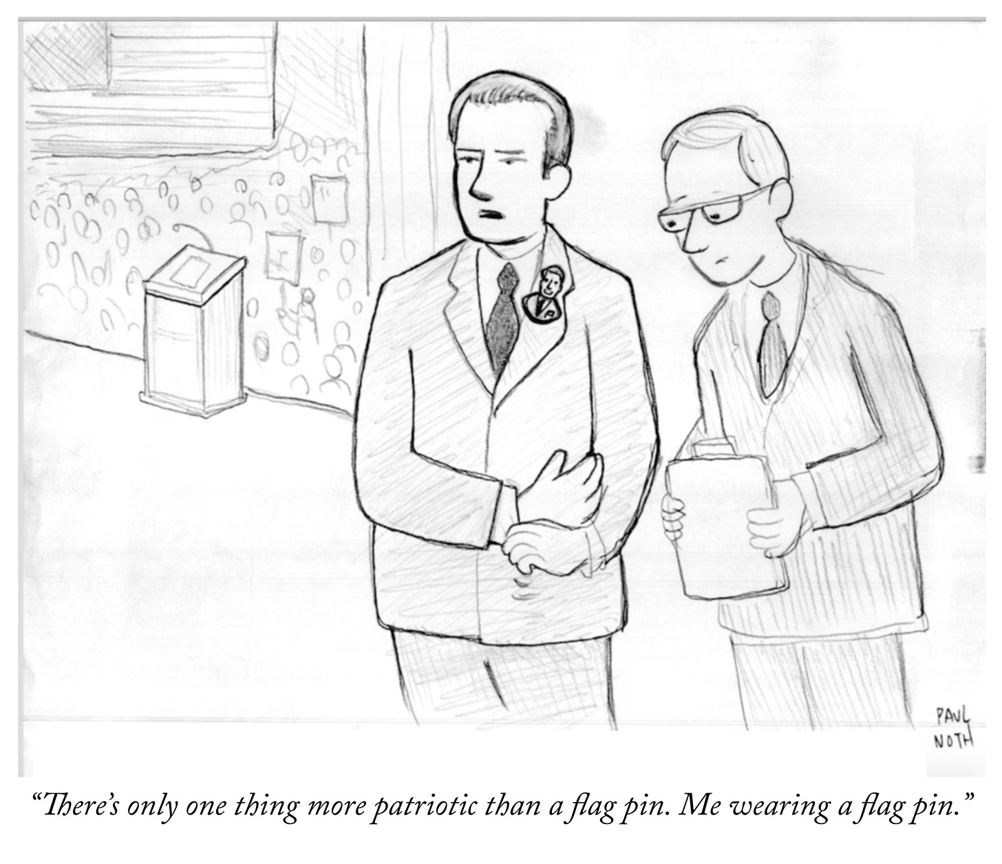 That might strike you as a completely different cartoon, but to me it’s the same idea made more palatable. And in this rare case, I have to insist that everyone in the world is wrong and I alone am right. That first version—with the politician wearing a pin of himself wearing the flag pin—is a lot funnier. I’m afraid I have to be very stubborn about this.