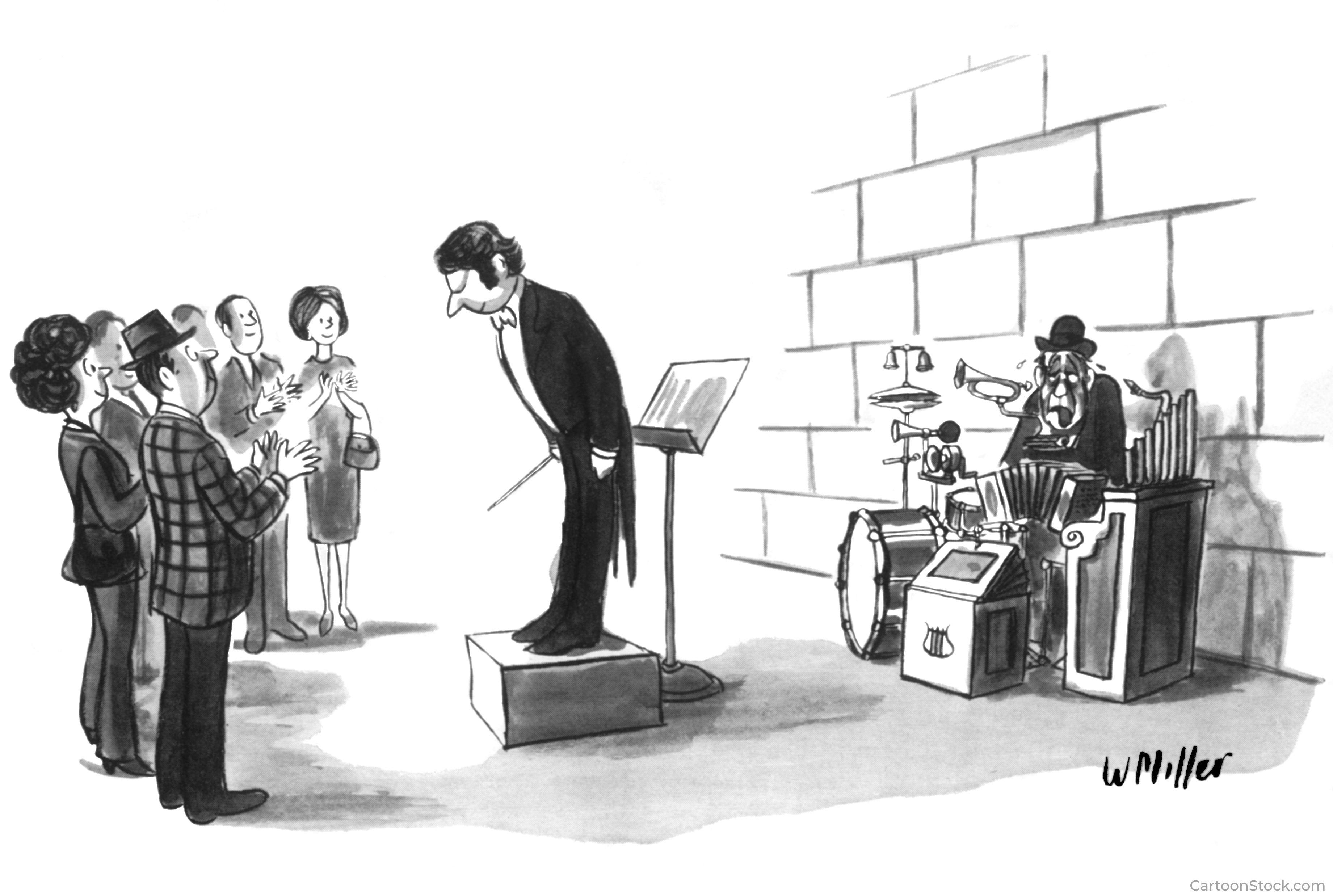I promptly stole Warren’s great bit of stage business: that deep bow to applauding bystanders. Suddenly the joke had room to breathe. It was a good reminder that timing is everything in humor—and in cartoons, timing is spatial. Even so, wordless cartoons never got any easier. I did, however, manage to sell two the following year.